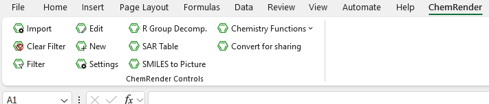 To install ChemRender start by opening Excel. ChemRender support Excel 2016 or later on Mac, Excel 2016 or later on Windows and Excel on the Web.